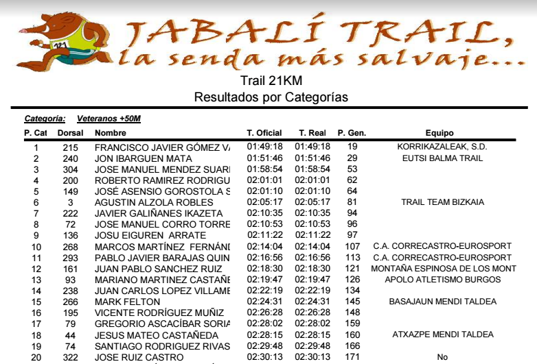 Por fin sale la clasificación y quedo el 1° en mi categoría, y el puesto 19 en la general. ¡Por fin el primero! ¡Lo conseguí!